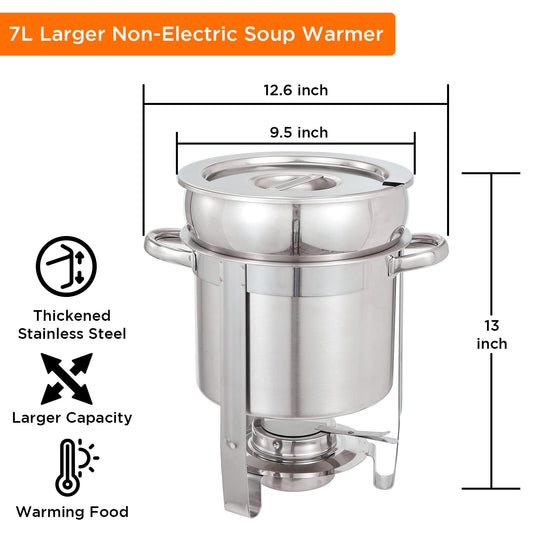 Upgraded 2 Pack Soup Chafer, 7 QT Stainless Steel Round Soup Warmer, Soup Chafer with Pot Lid and Fuel Holder for Parties Buffet Wedding Banquets Commercial Grade