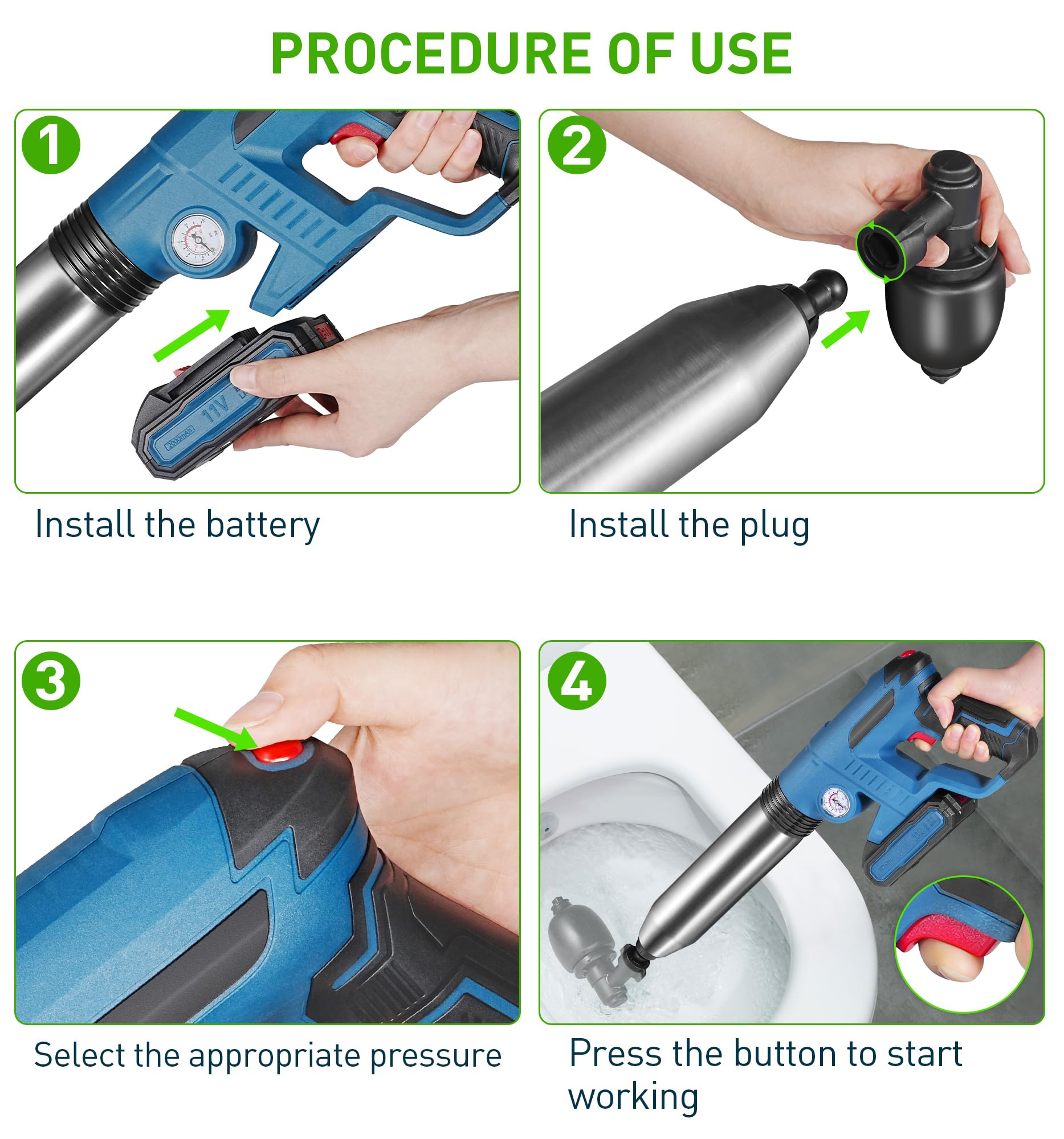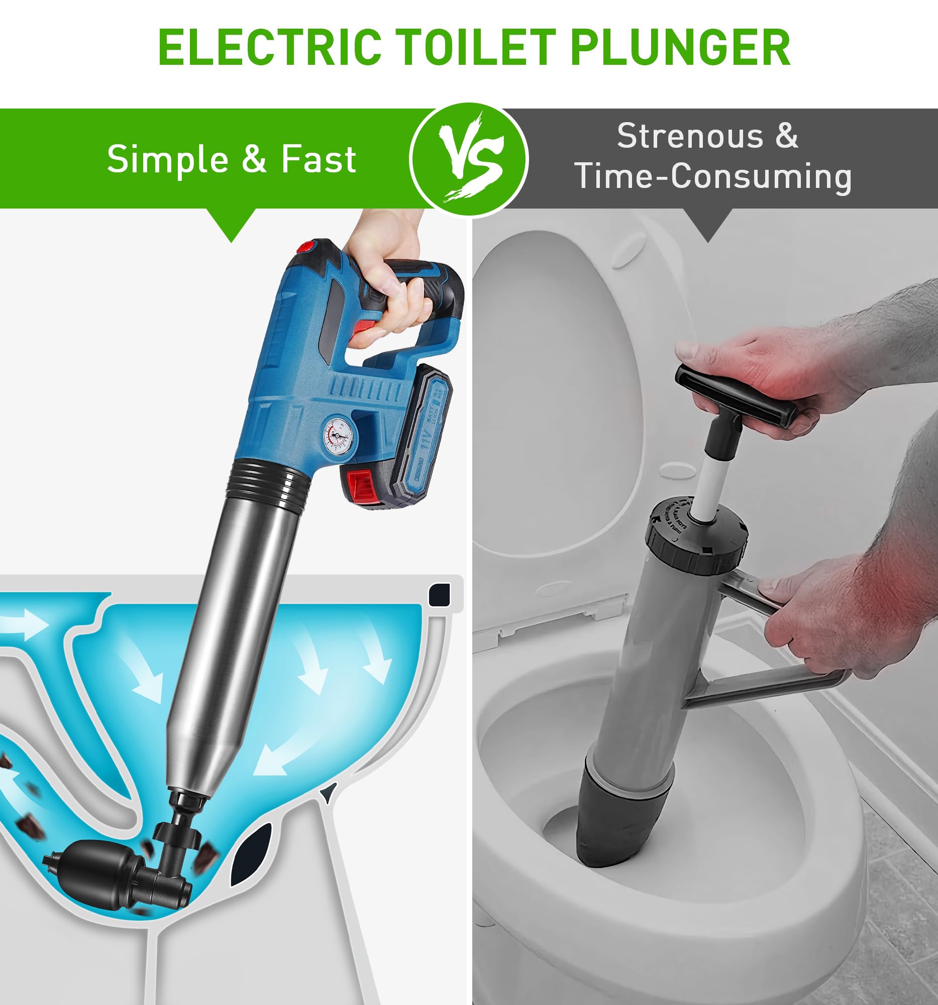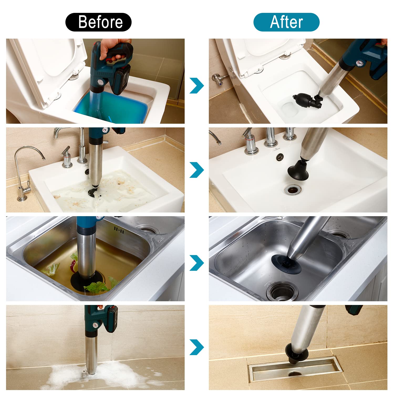 [High Air Pressure & Automatic inflation] The electric pipe power plunger was designed of high pressure compress air, and it can produce high-pressure gas through electrical mode, which can unclog the blockage of pipes more easily and more effectively than traditional manual plungers. Besides, the electric plunger can be inflated automatically and no manual inflation, bringing you more convenience and saving your labor.