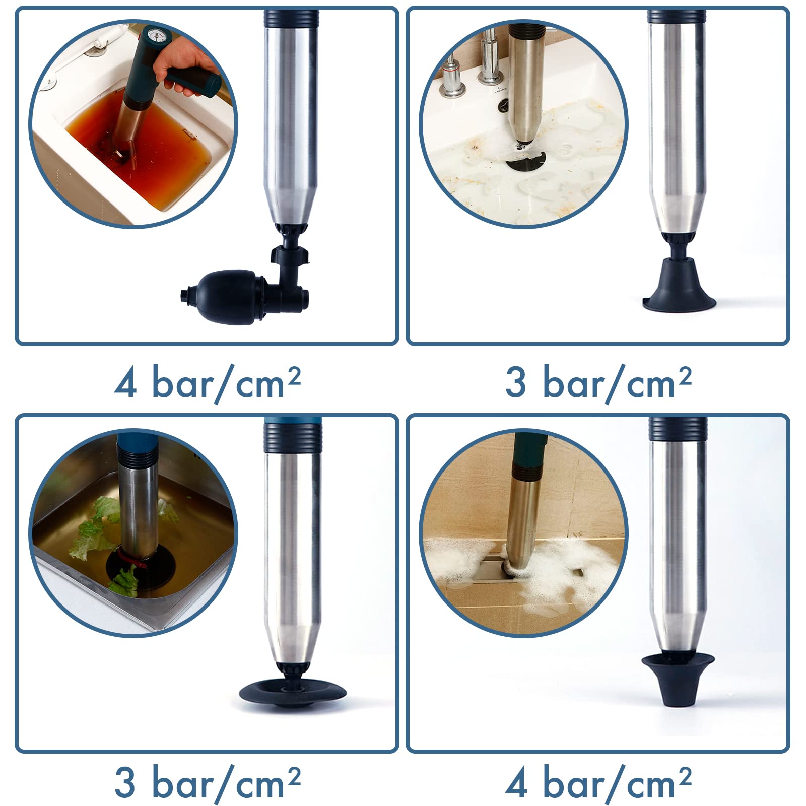 [4 Plug Head & Wide Application] The drain clog remover tools come up with 4 different unclogged heads, you can choose the suitable dredging head according to your need or different occasions, which can help you to solve the problem of clogged pipes caused by garbage effectively. So, this drain clog blaster is perfect for toilets, washstand, wash basin, bathroom, floor drain, kitchen sinks, etc. This clog remover drain is a good helper for dealing with the clog pipeline!