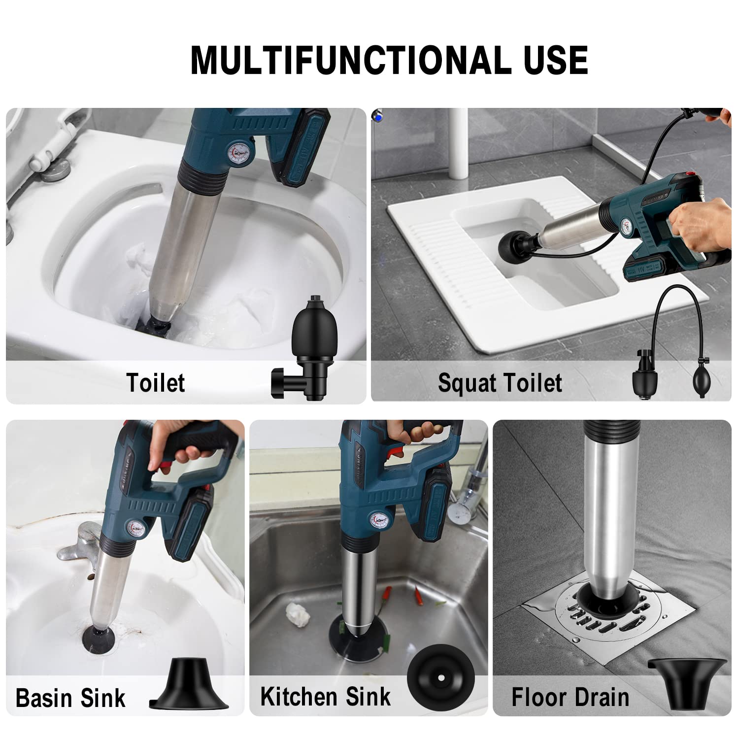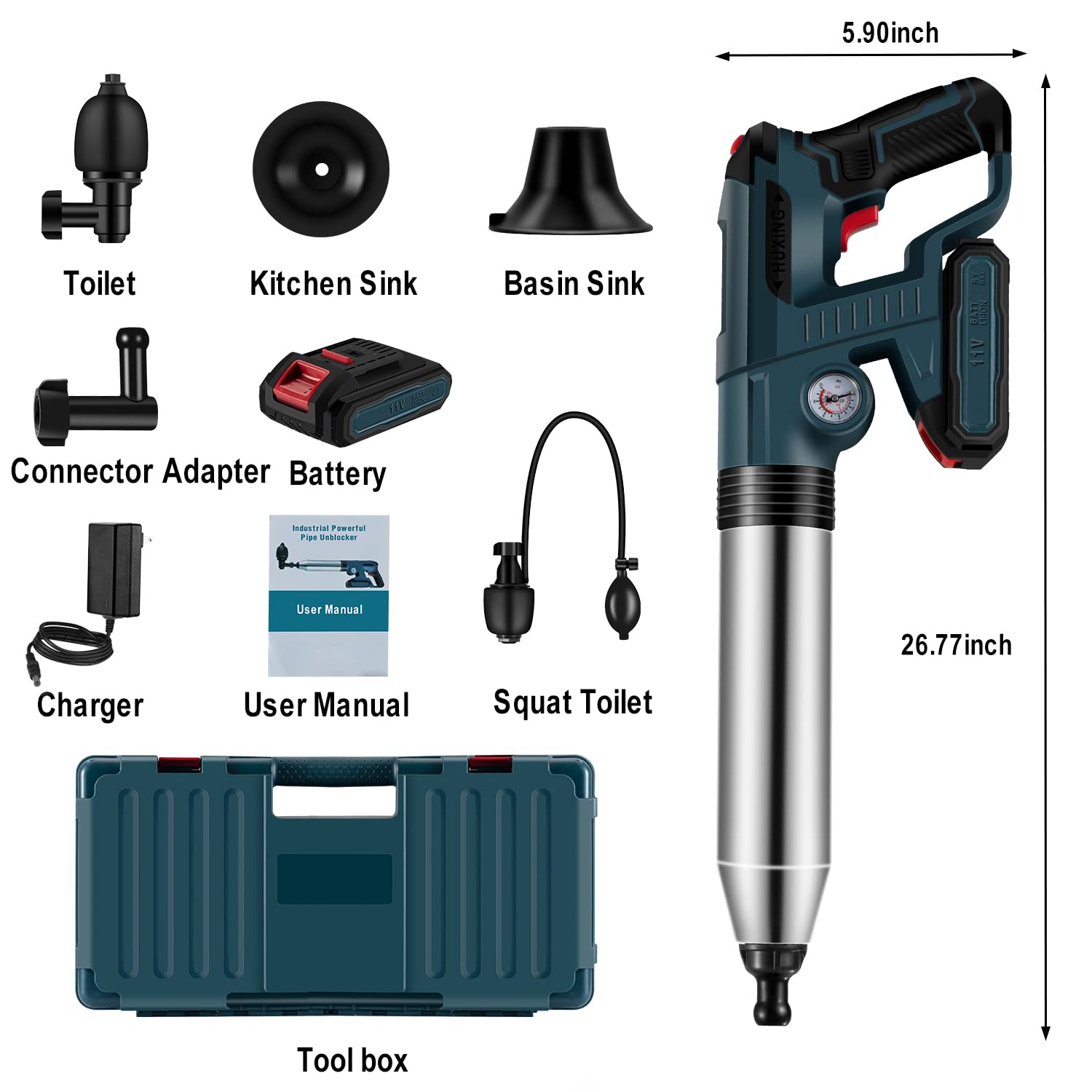 [Easy To Use & Portable] The air toilet plunger gun is easily operated. But you should confirm the power of battery before use, install the battery pack and suitable unclog head, after press the red switch to inflate, aim it at the clogged port, just press the deflation switch on the handle to clean the toilet or sink, which can help you to save money and time and without waiting for a plumber. Besides, equipped with a tool box, you can take it anywhere, anytime.
